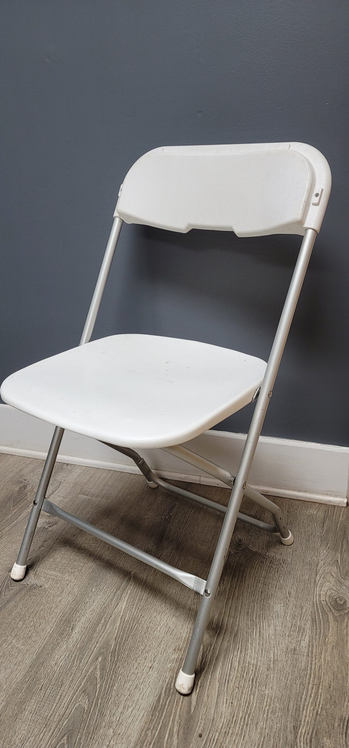 Plastic folding chair with gray frame.