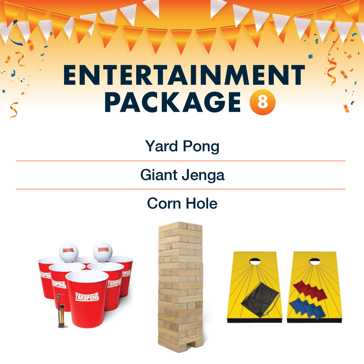 This package includes a Yard Pong, Giant Jenga, and Corn Hole.