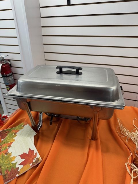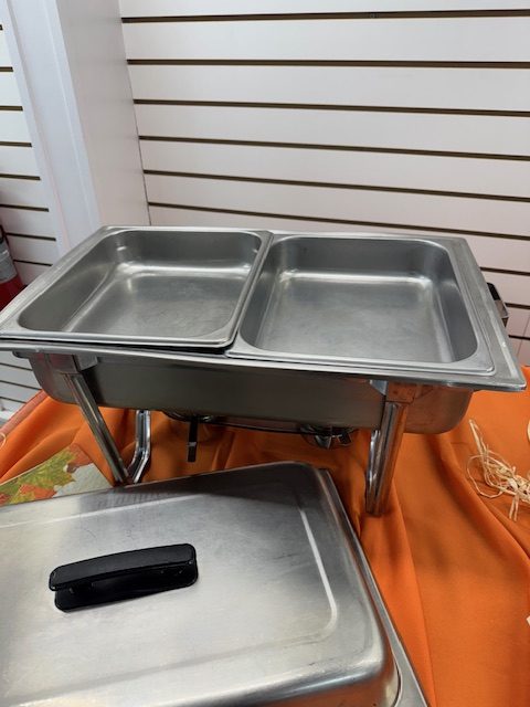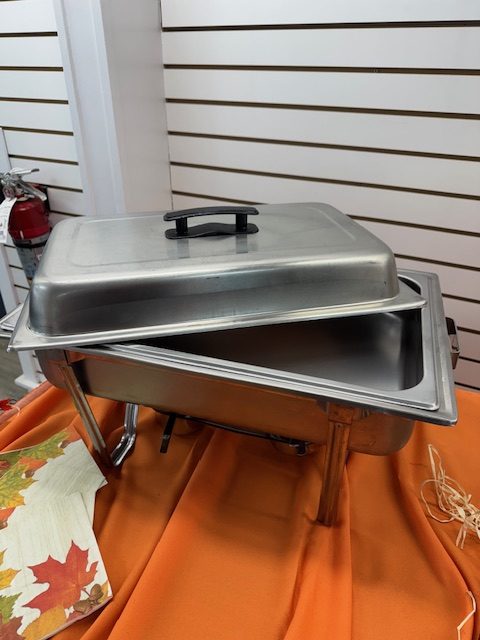 8qt stainless steel chafer set includes stand, water pan and lid.
